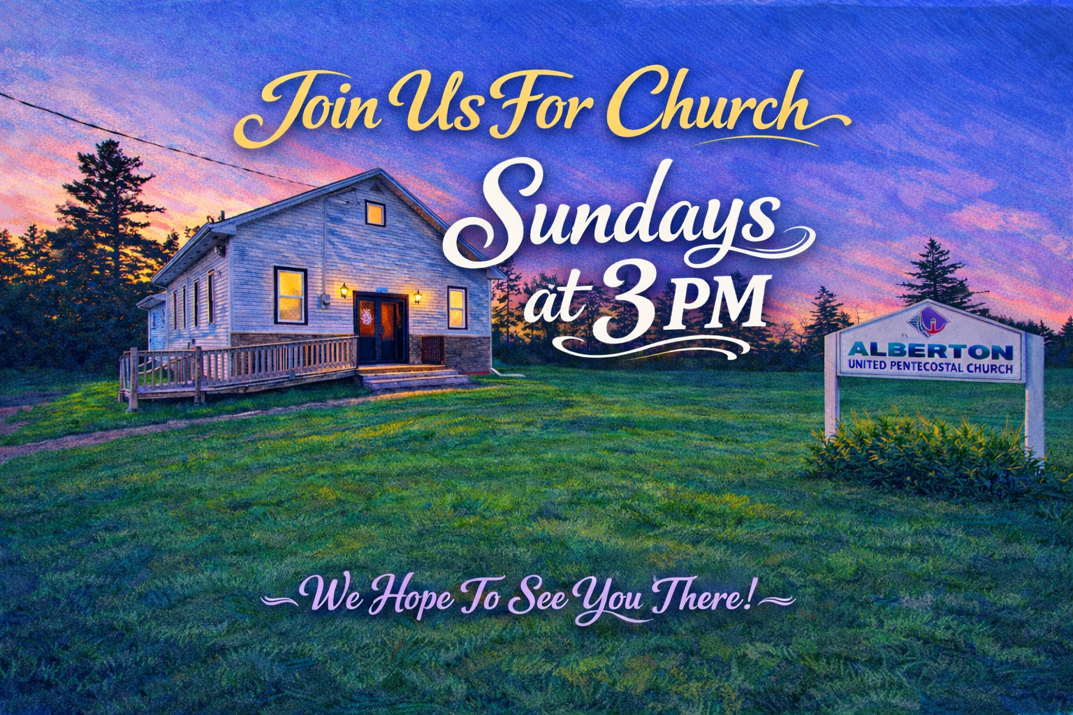 Sunday Worship3:00PM Youth ConnectApril 24 - 7:00PM Wednesday Bible Study7:00PM Atlantic Ladies ConferenceApril 17-18 Saturday Prayer7:00PM Atlantic Youth ConventionMay 15-17 Visit Alberton UPC You are welcome here Our hearts are open and praying for you to come and join with Jesus, to join with us sowe can change the world together! Contact Us